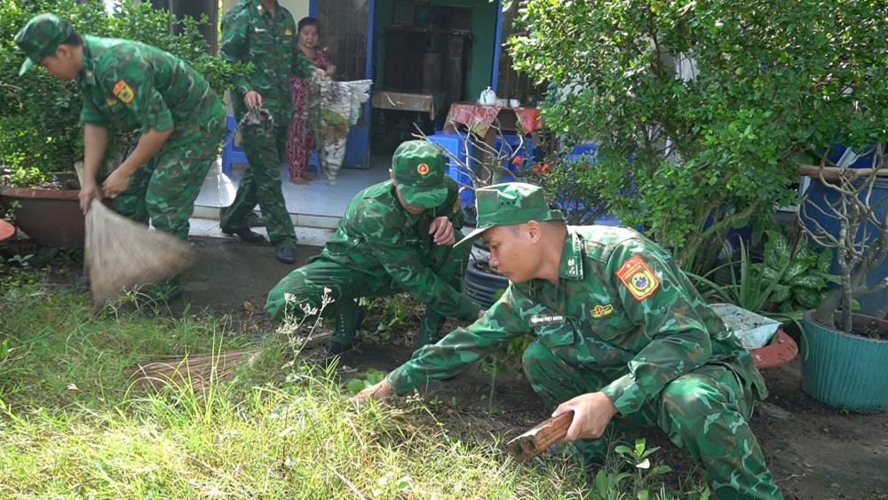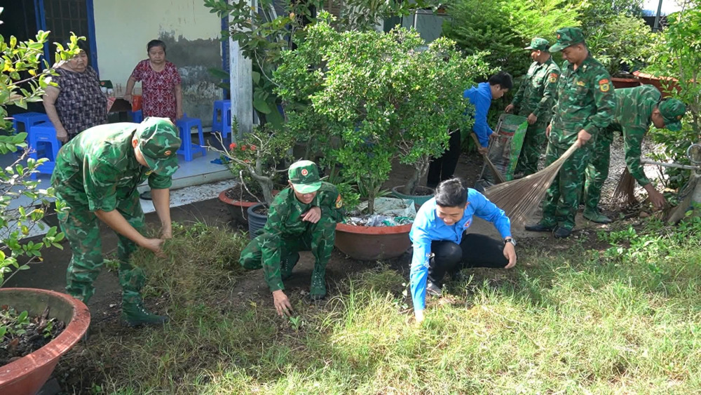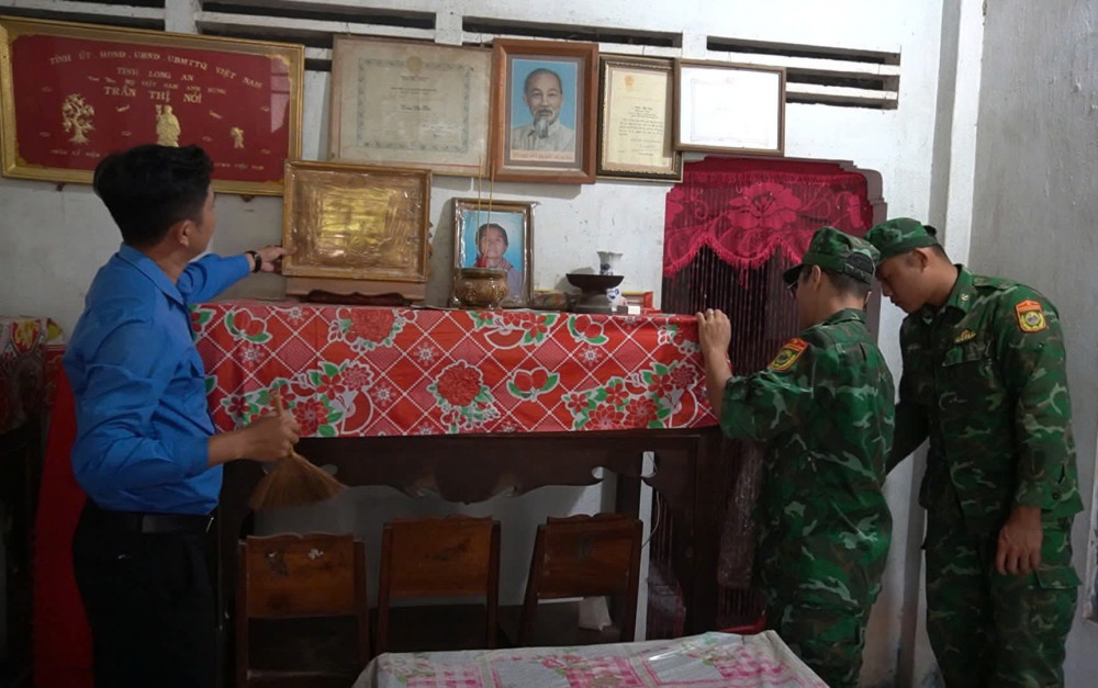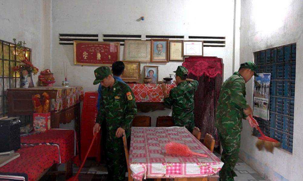 Cán bộ đoàn xã Mỹ Quý và cán bộ, chiến sĩ Đồn Biên phòng Cửa khẩu Mỹ Quý Tây tiến hành lau dọn nơi thờ cúng của Bà mẹ Việt Nam Anh hùng
