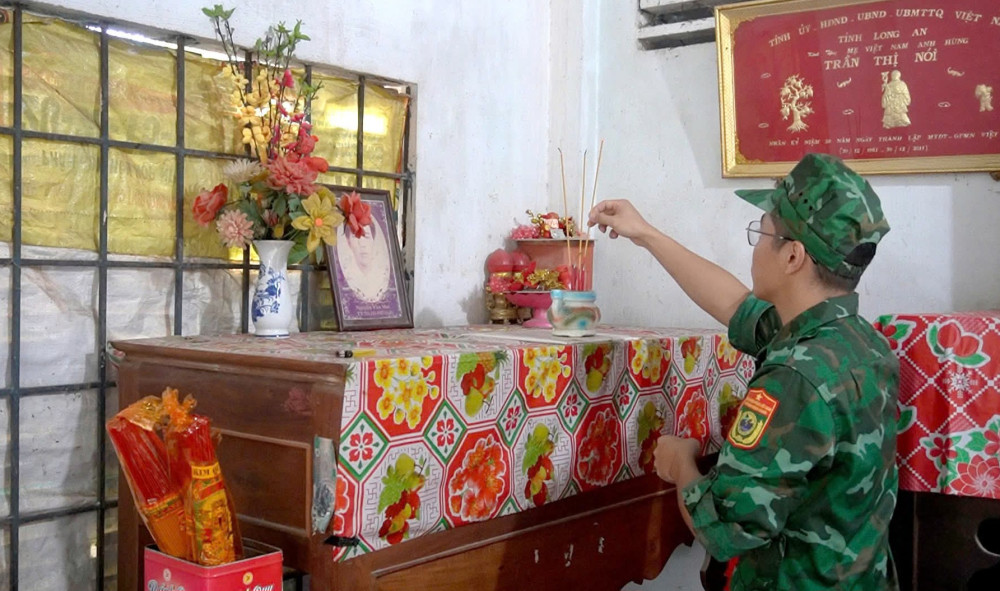 Cán bộ, chiến sĩ thắp nén nhang lên bàn thờ Bà mẹ Việt Nam Anh hùng