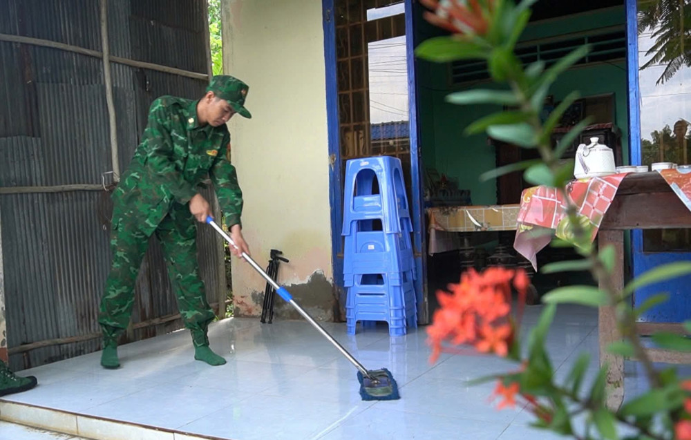 Cán bộ, chiến sĩ giúp lau nhà sạch sẽ