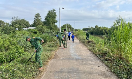 Cán bộ, chiến sĩ Đồn Biên phòng Thạnh Trị tham gia dọn vệ sinh đường giao thông nông thôn