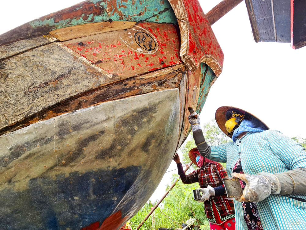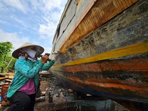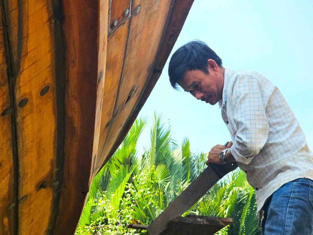 Bà Nguyễn Thị Điệp (áo sọc xanh) kể, trước đây, cha bà cũng làm nghề đóng ghe, bà biết về công việc đóng ghe từ khi mới 16 tuổi nhưng giờ đây gia đình không còn xưởng đóng ghe như trước nữa, bà đến làm tại xưởng đóng ghe của anh Hiệu (Trong ảnh: Bà Nguyễn Thị Điệp cùng các nhân công khác đang trét chai vào ghe, đây là công đoạn không thể thiếu khi sửa chữa ghe, thuyền)