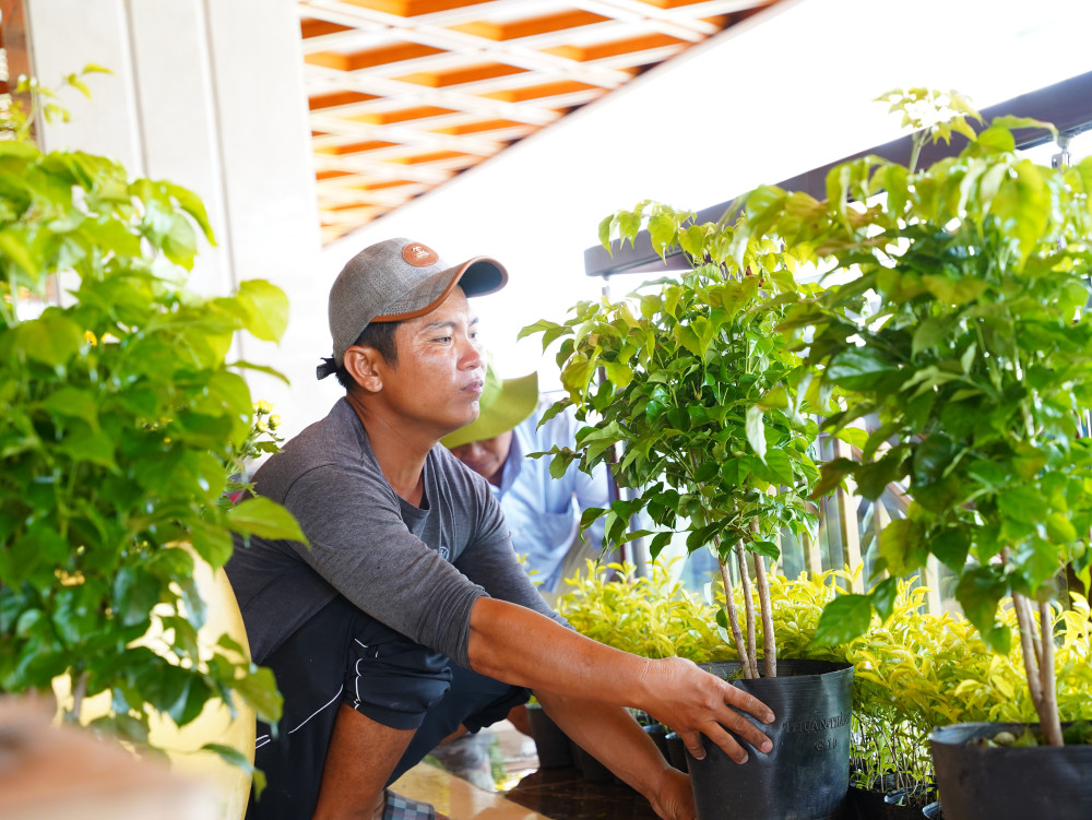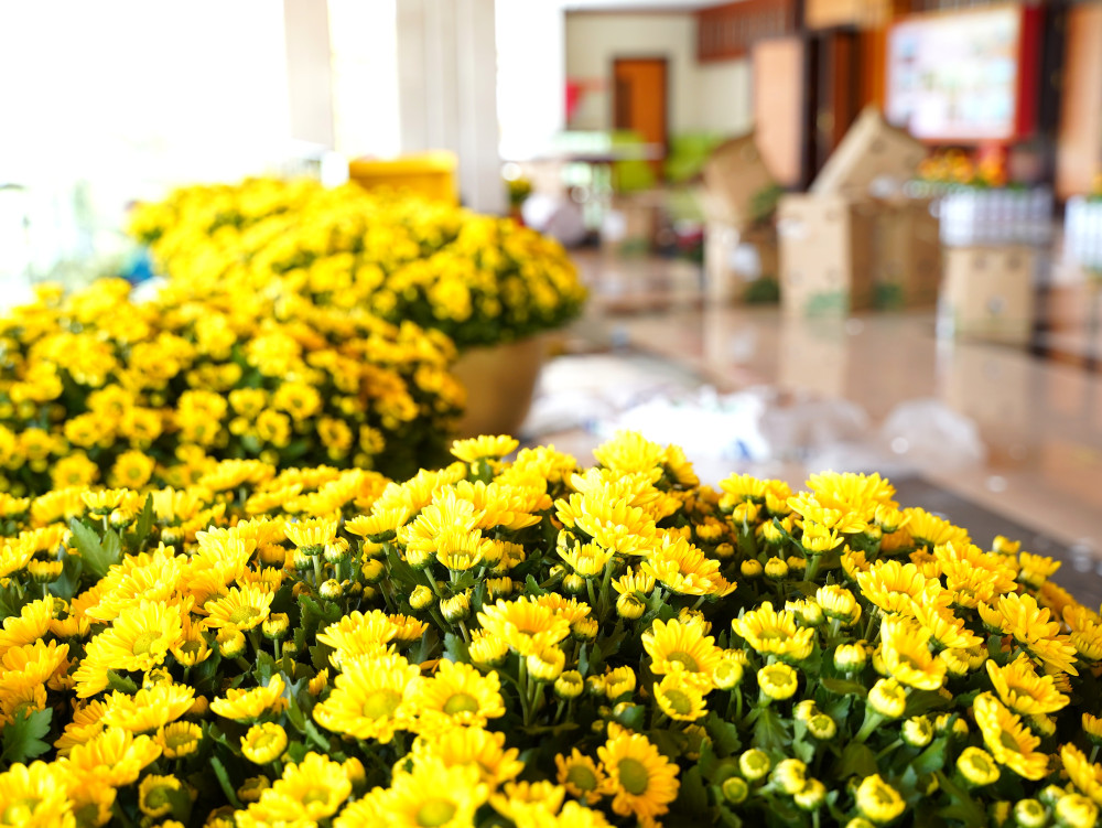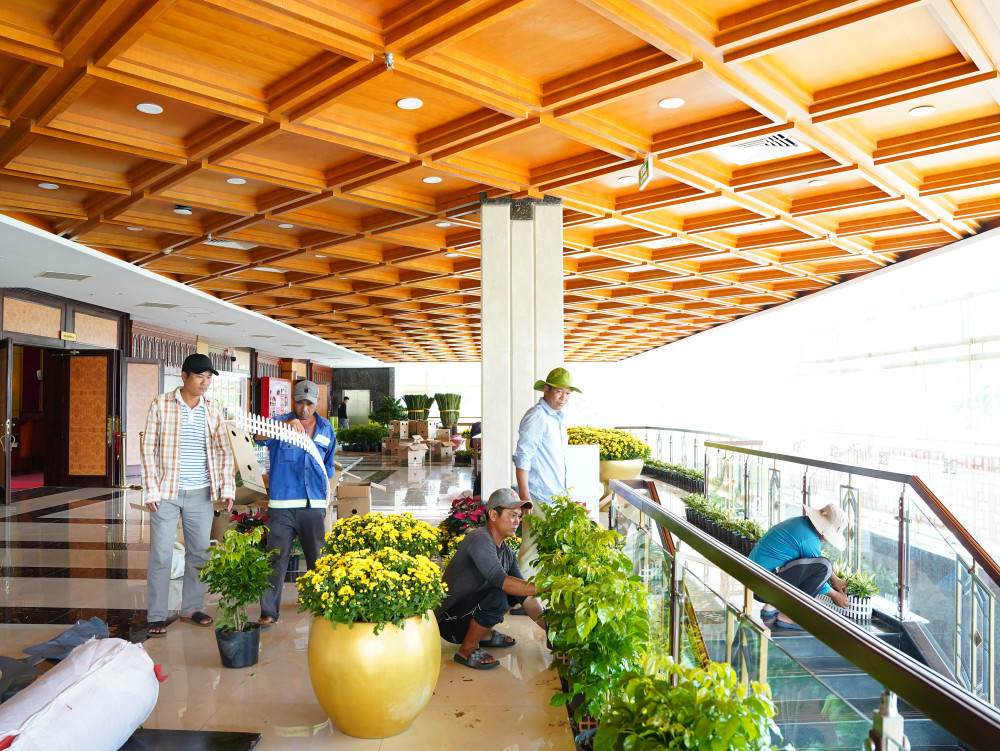 Hoa tươi và cây xanh được trang trí phía ngoài và phía trong hội trường