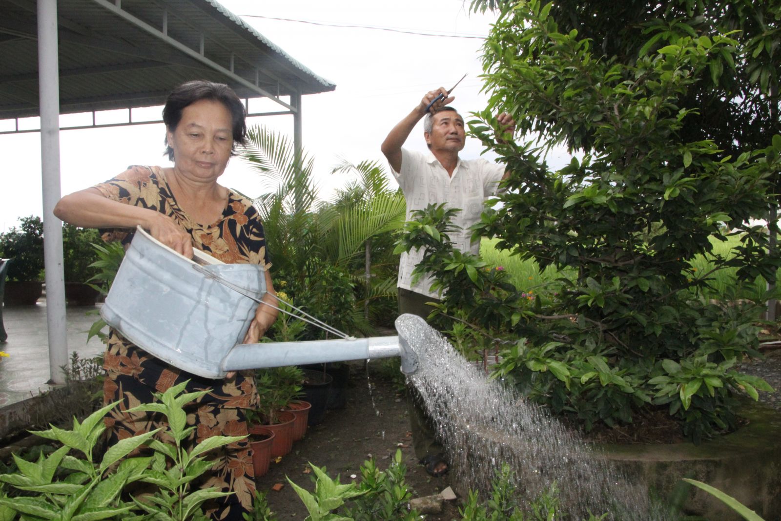 Vườn cây kiểng trước sân do ông Đặng Văn Hùng, bà Trương Thanh Thủy cùng nhau chăm tưới