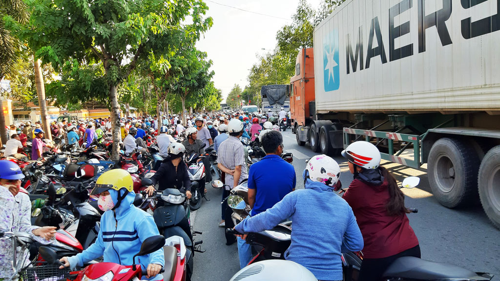 Vào giờ cao điểm từ 16 - 17 giờ, khi tan truờng, mô tô của phụ huynh đưa rước con em học tại Trường Tiểu học Nguyễn Trung Trực (phường 3, TP.Tân An, tỉnh Long An) đậu lấn chiếm lòng đường Châu Thị Kim trước cổng truờng; xe tải, xe buýt lưu thông gây ùn tắc, tiềm ẩn nguy cơ tai nạn giao thông rất cao.