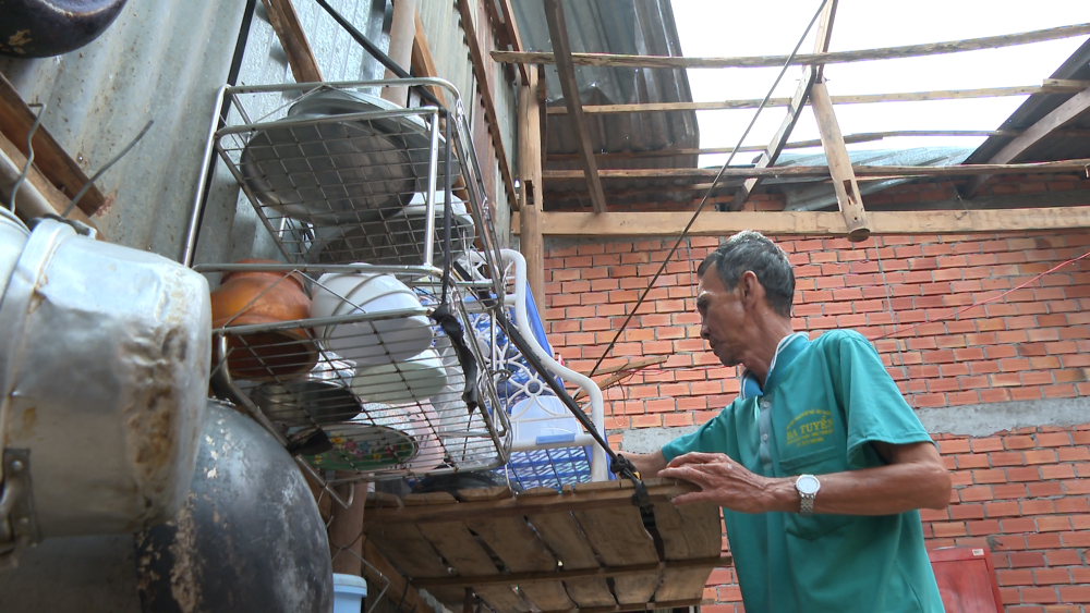Ông Lê Văn Phóng (ngụ xã Tân Hưng) dọn dẹp nhà cửa sau khi bị tốc mái