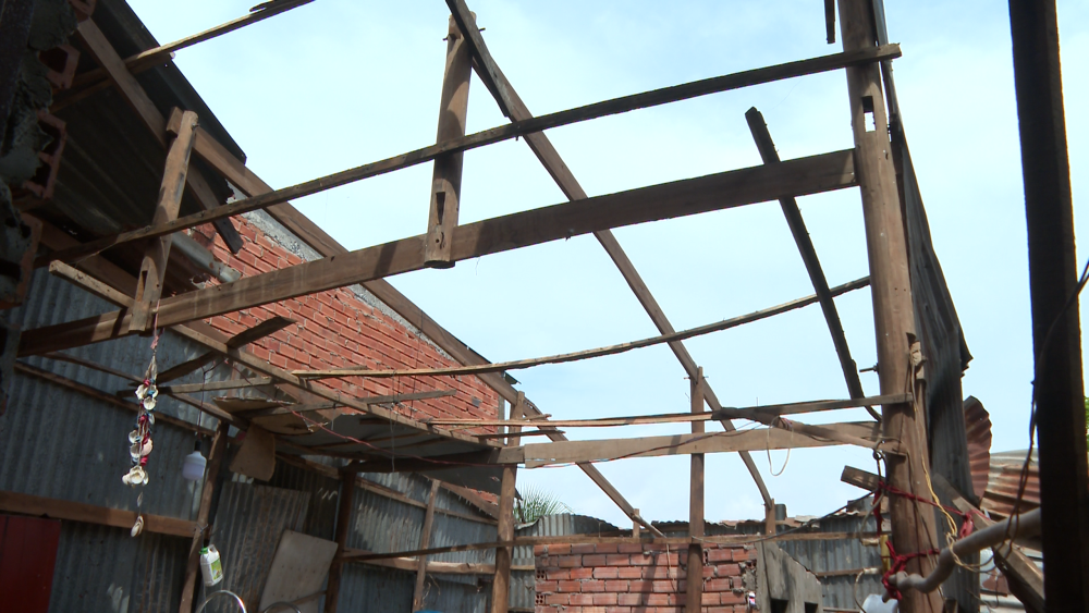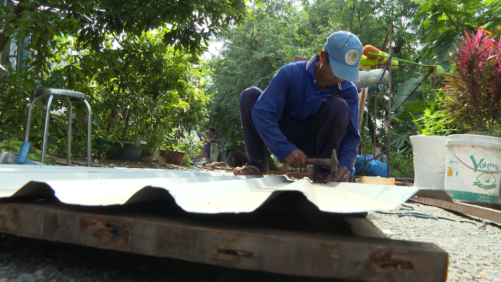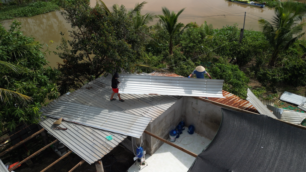 Gia đình bà Trương Thị Nhành (ngụ xã Tân Hưng, tỉnh Tây Ninh) lợp lại mái nhà sau khi bị mưa và gió giật mạnh làm tốc mái