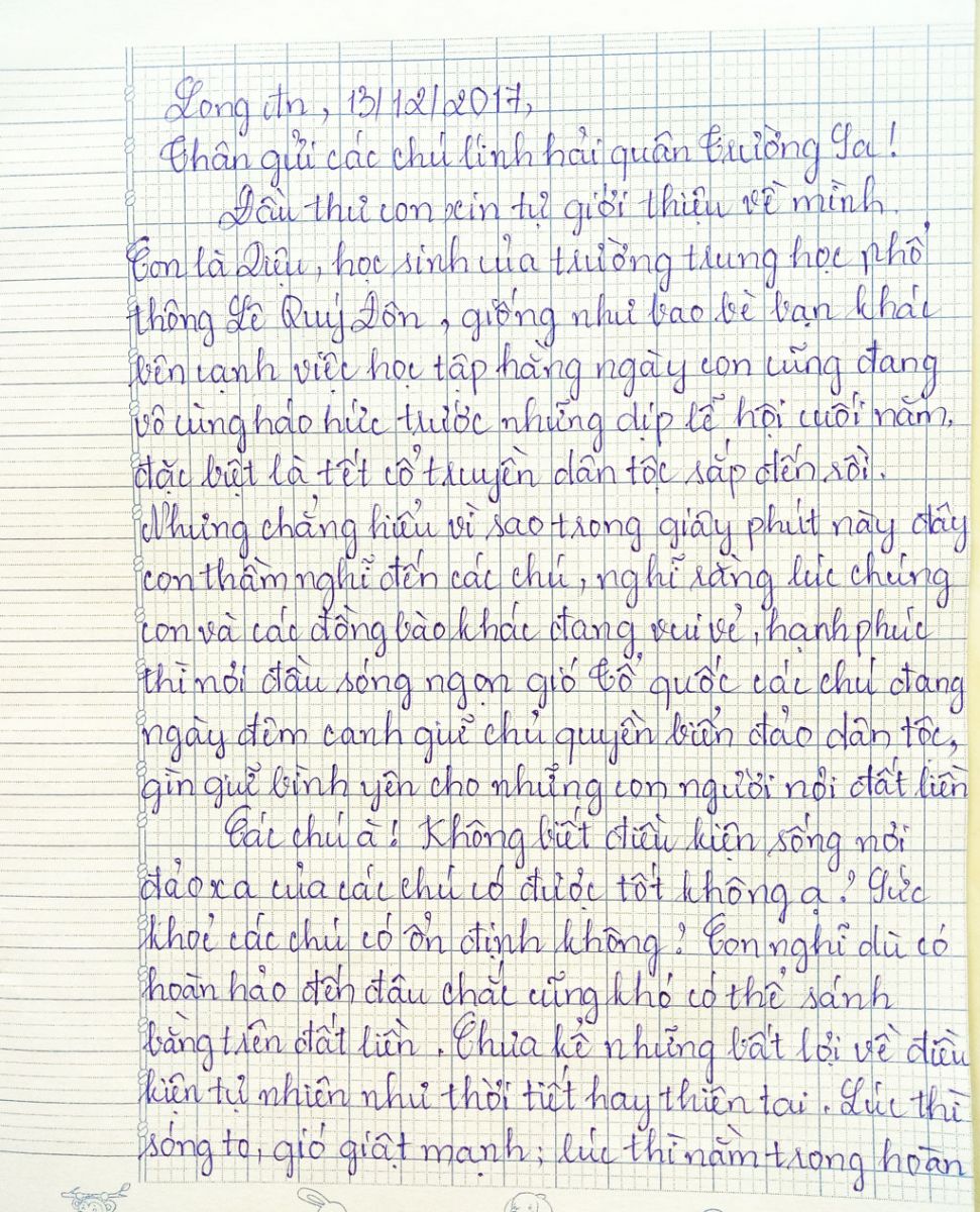 Long An, ngày... tháng... năm... Mở đầu lá thư xuân, em Hồ Võ Duy Diệu - học sinh lớp 11/4, Trường THPT Lê Quý Đôn, viết: “Con chưa từng đặt chân đến Trường Sa. Con chỉ biết đó là một huyện đảo cách đất liền hai trăm năm mươi hải lý về phía Đông Tổ quốc, được biết về ngọn đèn hải đăng thắp sáng một vùng biên thùy Tổ quốc qua bài viết “Thắp sáng nhà giàn DK1” của Báo Tuổi trẻ... Trong khi con và đồng bào cả nước đang vui vẻ, hạnh phúc đón xuân thì nơi đầu sóng ngọn gió, các chú đang ngày đêm canh giữ chủ quyền biển, đảo Tổ quốc, gìn giữ bình yên cho những người ở đất liền...”.