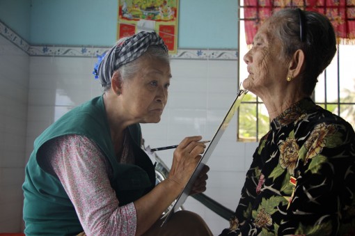 Đã biết họa sĩ Đặng Ái Việt qua báo chí, nhưng đây là lần đầu tiên chúng tôi được gặp và theo chân bà trong hành trình vẽ chân dung các Mẹ VNAH. Nữ họa sĩ bình dân đến ngỡ ngàng! Bà xuất hiện trên chiếc “cánh phượng” quen thuộc với đầy đủ dụng cụ vẽ và lỉnh kỉnh vật dụng khác cần có cho những chuyến đi xa. Ngoài 70 tuổi, nữ họa sĩ chưa hề “ngán” bất cứ cung đường nào dẫn về nhà các mẹ, dù đó là vùng cao hiểm trở, vùng sâu đường sá gập ghềnh hay những con hẻm nhỏ ngoằn ngoèo bụi phủ.