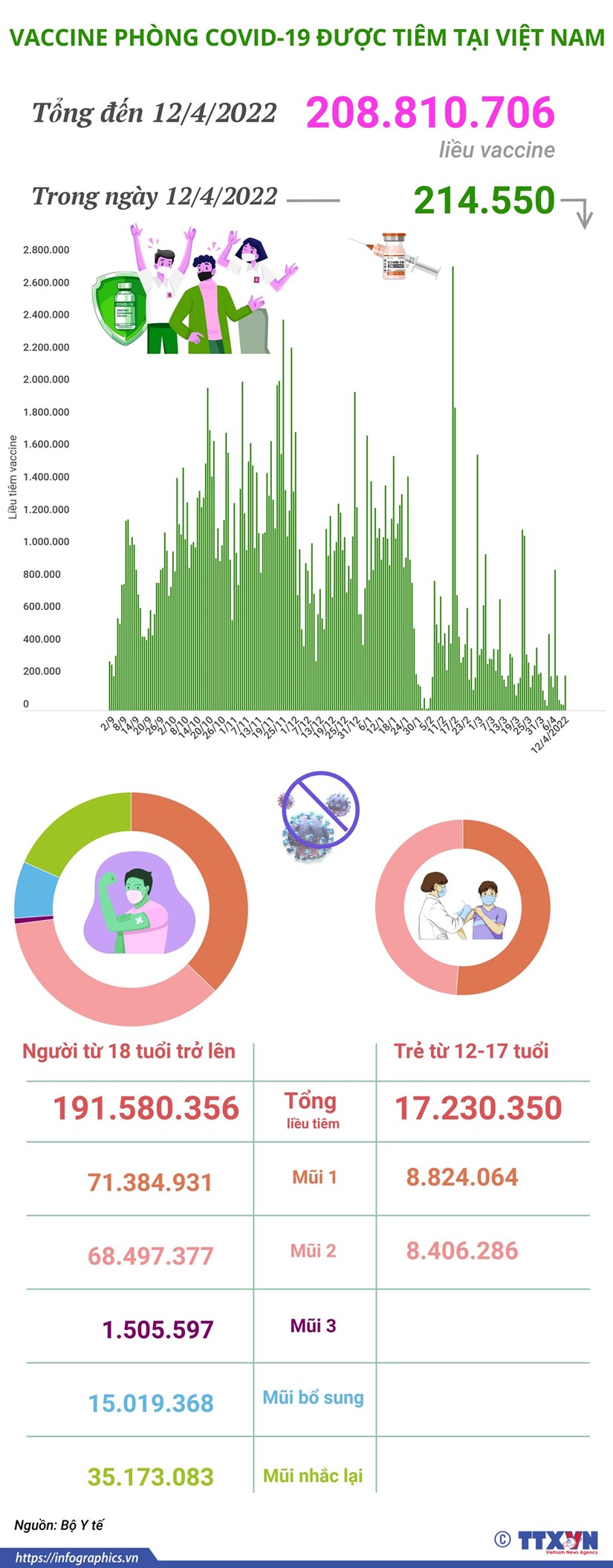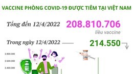Trong ngày 12/4/2022 có 214.550 liều vaccine phòng COVID-19 được tiêm. Như vậy, tổng số liều vaccine đã được tiêm tại Việt Nam là 208.810.706 liều, trong đó tiêm cho người từ 18 tuổi trở lên là 191.580.356 liều và tiêm cho trẻ từ 12-17 tuổi là 17.230.350 liều./.