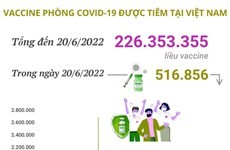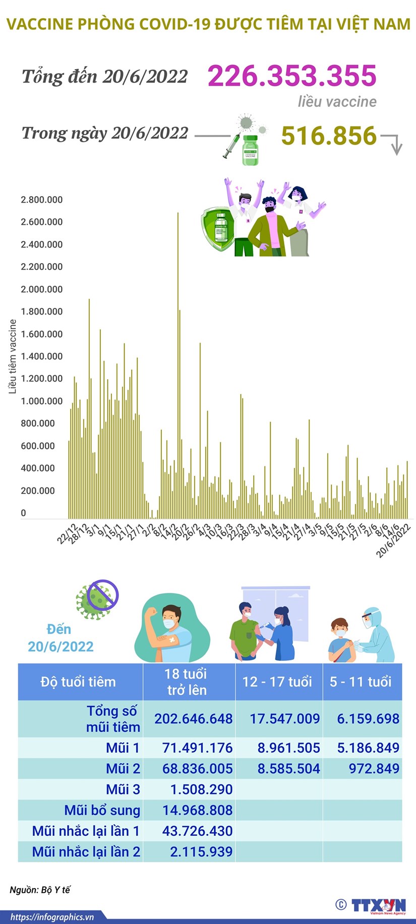 Trong ngày 20/6/2022 có 516.856 liều vaccine phòng COVID-19 được tiêm. Như vậy, tổng số liều vaccine đã được tiêm tại Việt Nam là 226.353.355 liều trong đó tiêm cho người từ 18 tuổi trở lên là 202.646.648 liều, tiêm cho trẻ từ 12-17 tuổi là 17.547.009 liều và tiêm cho trẻ từ 5-11 tuổi là 6.159.698 liều./.
