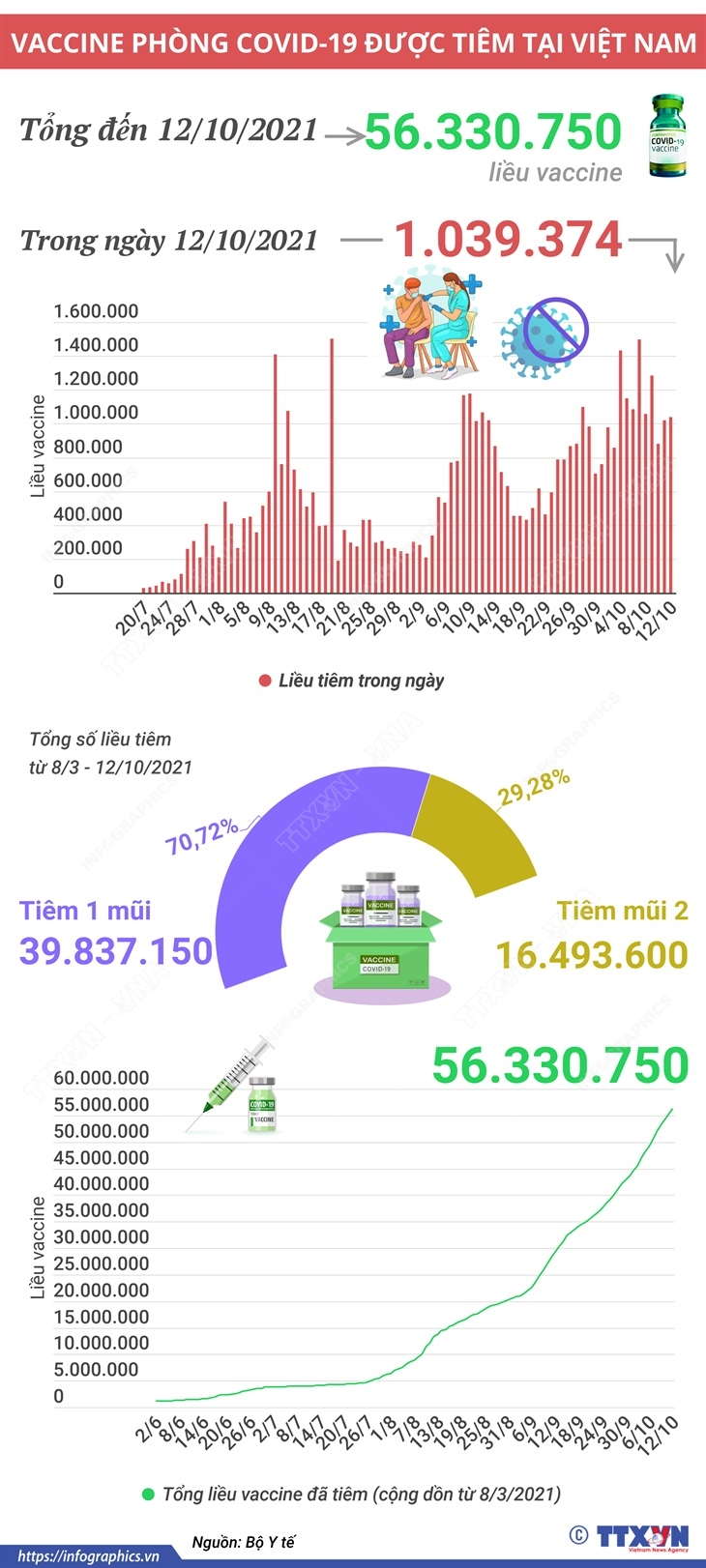 Trong ngày 12/10 có 1.039.374 liều vaccine phòng COVID-19 được tiêm.