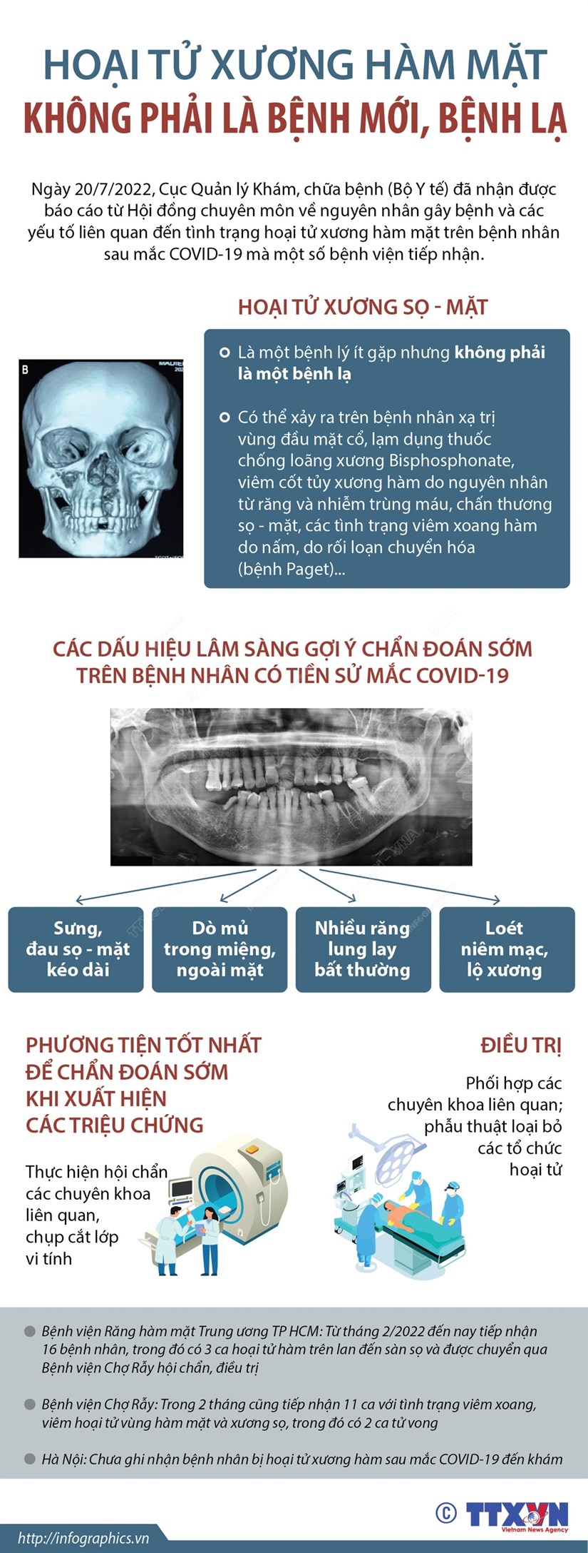 Ngày 20/7, Cục Quản lý Khám, chữa bệnh (Bộ Y tế) đã nhận được báo cáo từ Hội đồng chuyên môn về nguyên nhân gây bệnh và các yếu tố liên quan đến tình trạng hoại tử xương hàm mặt trên bệnh nhân sau mắc COVID-19 mà một số bệnh viện tiếp nhận.