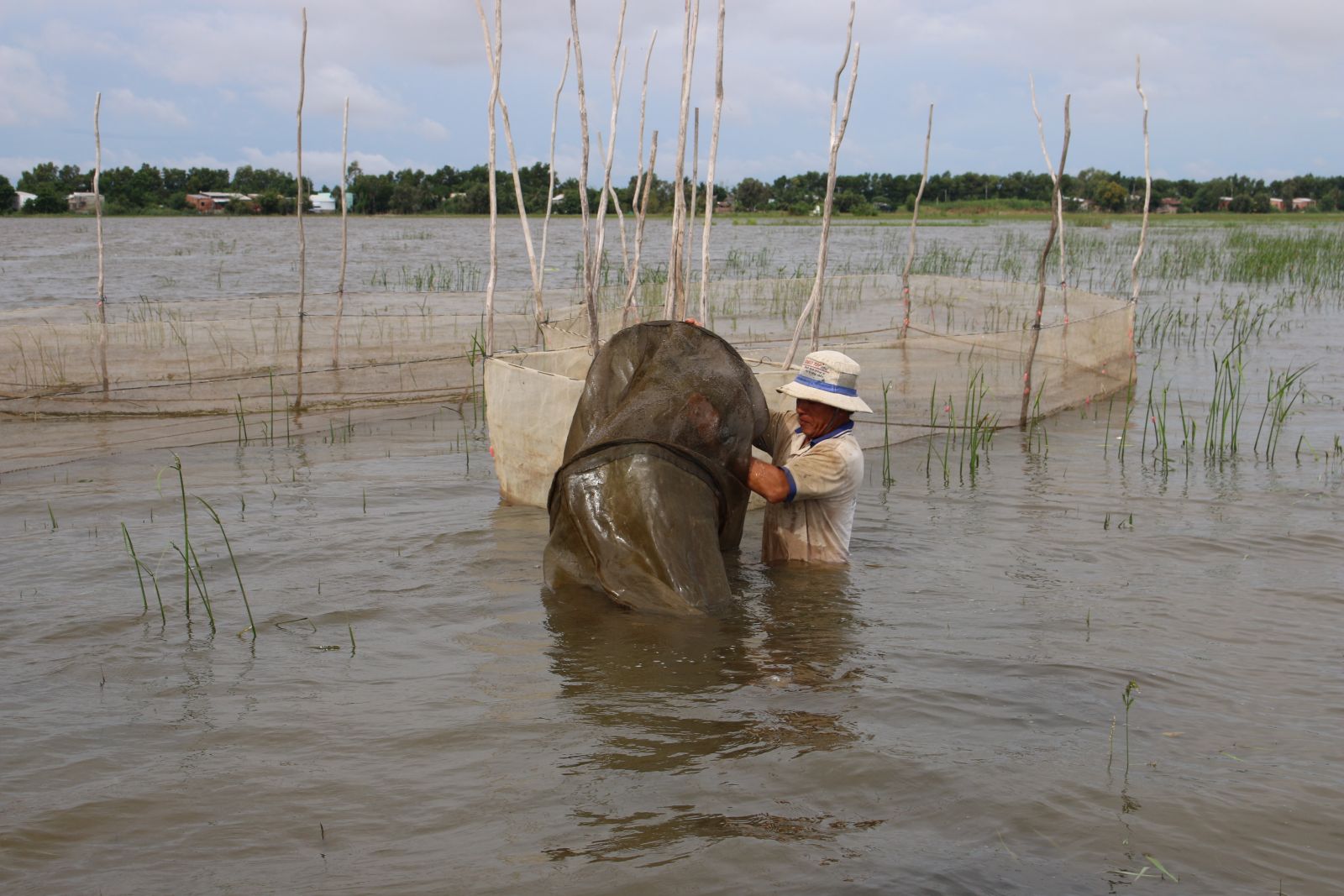 Một cách khai thác khác mà người dân hay sử dụng là đặt dớn (mắt lưới nhỏ hơn quyi định) giăng như “ma trận”, phủ trắng các cánh đồng. Đang kiểm tra dớn vào sáng sớm, anh Phú, ngụ xã Vĩnh Châu B, huyện Tân Hưng, cho biết, trước đây cá nhiều, mọi người chủ yếu bắt cá lớn để bán. Còn những năm gần đây, cá khan hiếm quá nên cá nào cũng bắt. “Tôi biết đặt dớn bắt cá nhỏ thế này là vi phạm, nhưng trên đồng đầy dớn, ai cũng đặt thì mình đặt theo”.