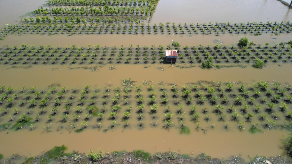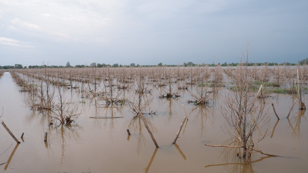 Triều cường dâng kết hợp mưa lớn làm nhiều diện tích mai vàng dọc sông Vàm Cỏ Tây bị ảnh hưởng (Ảnh: VĨNH HƯNG)