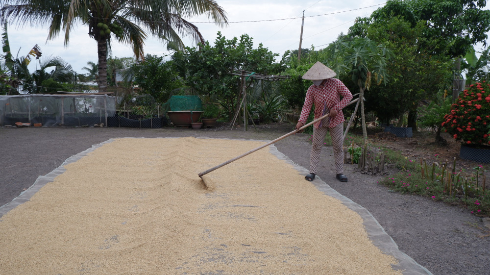 Chị Nguyễn Thị Bích đang phơi lúa ngoài sân. Số lúa này chị mua từ một nông dân khác để xay gạo ăn