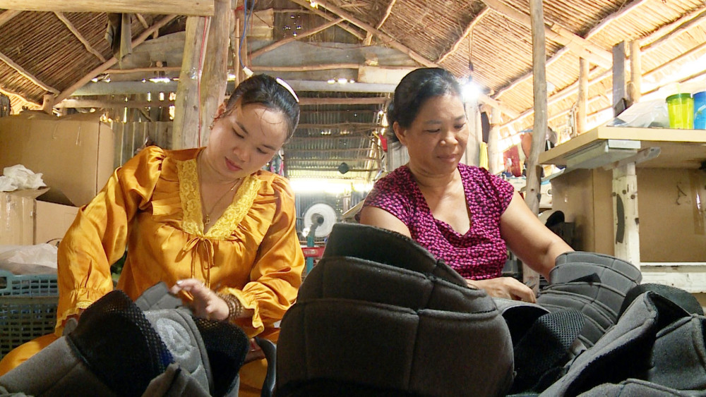 Chị Trần Thị Liên (ấp Tân Hòa, xã Bình Hòa Bắc, huyện Đức Huệ, bên phải) may gia công để kiếm thêm thu nhập