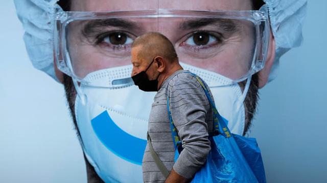 Một người đàn ông với chiếc khẩu trang bảo vệ đi lại trong thành phố Madrid, Tây Ban Nha