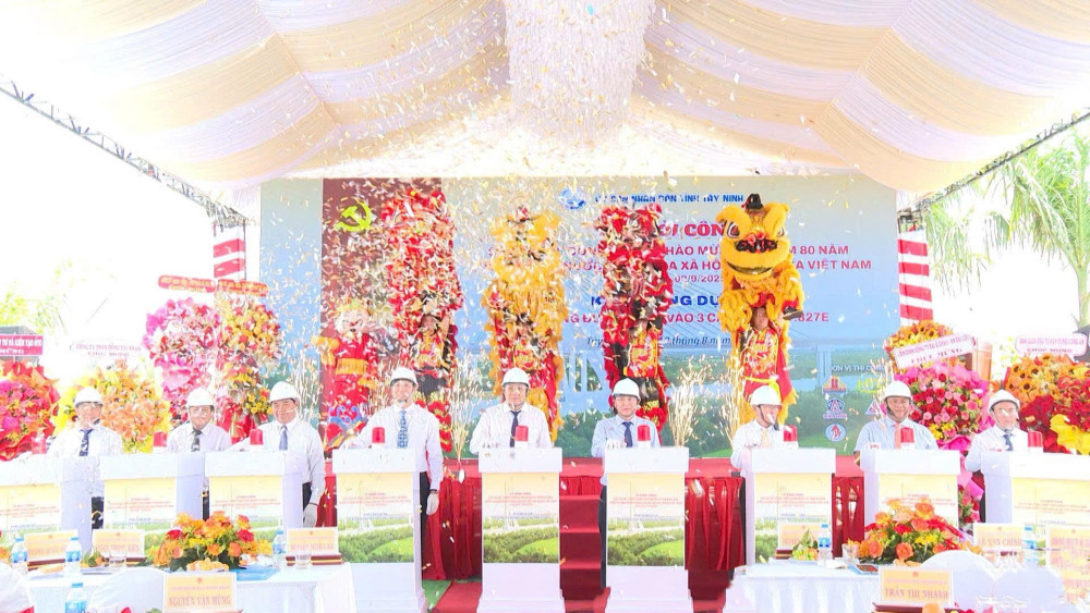 Hòa cùng không khí cả nước đồng loạt khởi công 250 công trình, dự án tại 80 điểm cầu, tại điểm cầu xã Tân Trụ - nơi khởi công Dự án xây dựng đường dẫn vào 3 cầu trên Đường tỉnh (ĐT) 827E cũng sôi nổi không kém. Chương trình có sự tham dự của Phó Bí thư Tỉnh ủy, Chủ tịch UBMTTQ Việt Nam tỉnh Tây Ninh Nguyễn Thanh Hải.