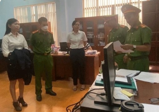 Lực lượng chức năng thi hành Lệnh bắt bị can để tạm giam và khám xét nơi làm việc của bà Hứa Thị Thể.