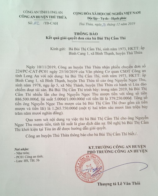 Gần đây, bà Bùi Thị Cẩm Thi, ngụ ấp Bình Cang 1, xã Bình Thạnh, huyện Thủ Thừa, tỉnh Long An có đơn tố cáo ông Nguyễn Ngọc Thu có hành vi lừa đảo chiếm đoạt tài sản.