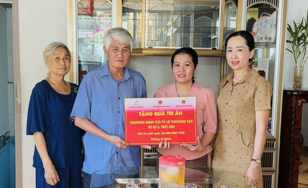 Hướng tới kỷ niệm 80 năm Quốc khánh nước Cộng hòa xã hội chủ nghĩa Việt Nam (02/9/1945 - 02/9/2025), thực hiện kế hoạch của Sở Nội vụ tỉnh Tây Ninh về việc trao tặng quà cho người có công từ nguồn tài trợ của quỹ Thiện Tâm, thuộc Tập đoàn Vingroup, sáng 23/8, Phó Chủ tịch UBND phường Tân Ninh Nguyễn Thị Thiên Hương đến thăm, tặng quà các thương binh nặng trên địa bàn phường.