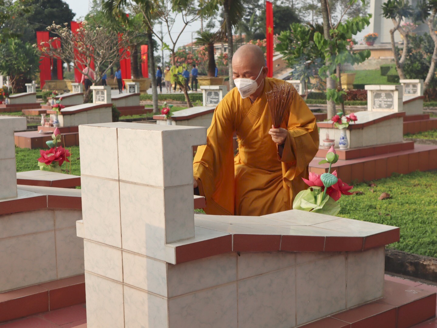 Trưởng Ban Trị sự Giáo hội Phật giáo Việt Nam tỉnh Long An - Hòa thượng Thích Minh Thiện thắp hương lên các phần mộ liệt sĩ