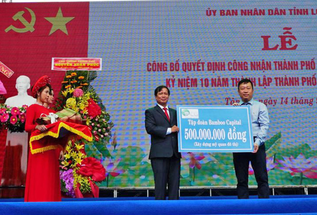 Đại diện doanh nghiệp (bìa phải) trao kinh phí hỗ trợ TP.Tân An xây dựng mỹ quan đô thị
