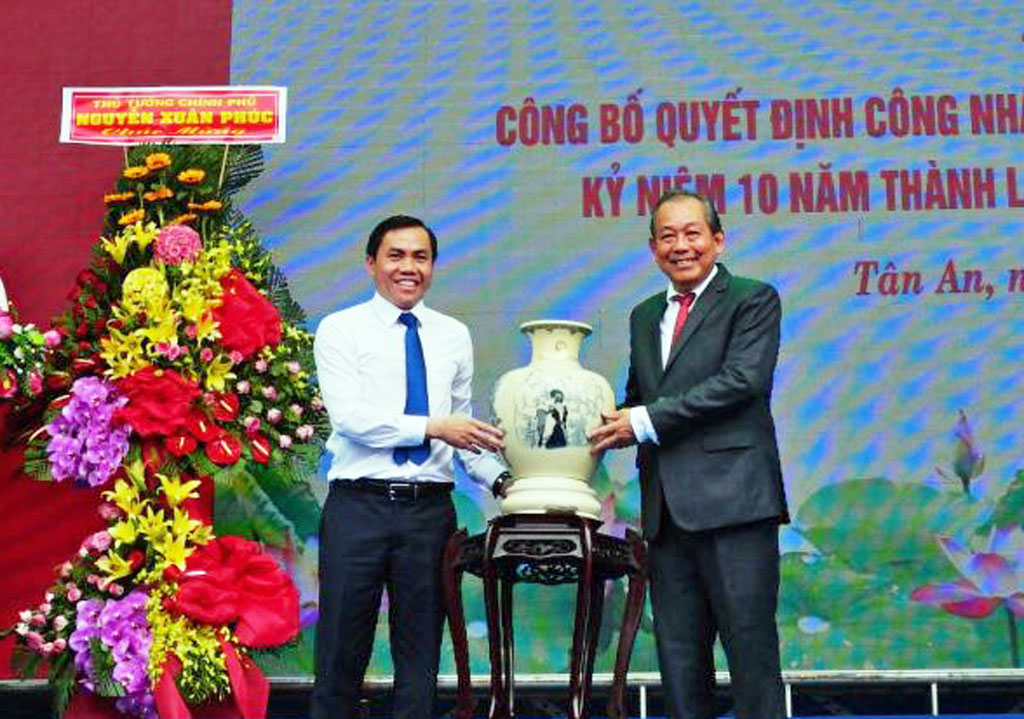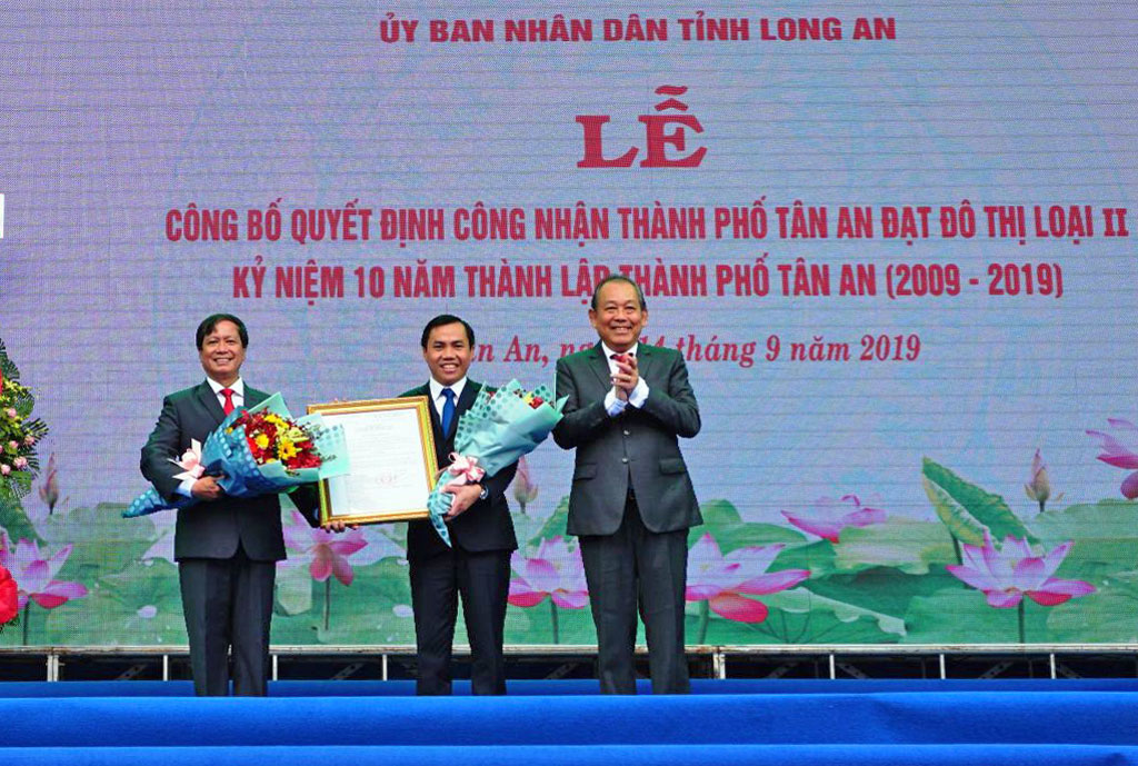 Thừa ủy quyền của Thủ tướng Chính phủ, Phó Thủ tướng Thường trực Chính phủ - Trương Hòa Bình trao Quyết định công nhận TP.Tân An đạt đô thị loại II