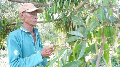 Cách đây 7 năm, ông Trần Quốc Thịnh (xã Tân Lập, huyện Tân Thạnh) chuyển 5.000m2 đất trồng lúa sang trồng sầu riêng. Sau 4 năm, vườn sầu riêng bắt đầu cho trái nhưng năng suất thấp, khoảng 2,5 tấn, giá thương lái thu mua tại vườn 60.000 đồng/kg. Thấy các hộ xung quanh xử lý trái nghịch mùa để bán giá cao hơn nên ông Thịnh làm theo. Không có kinh nghiệm, cộng với hạn, xâm nhập mặn kéo dài dẫn đến cây bị suy, vườn sầu riêng lấy trái không đạt.