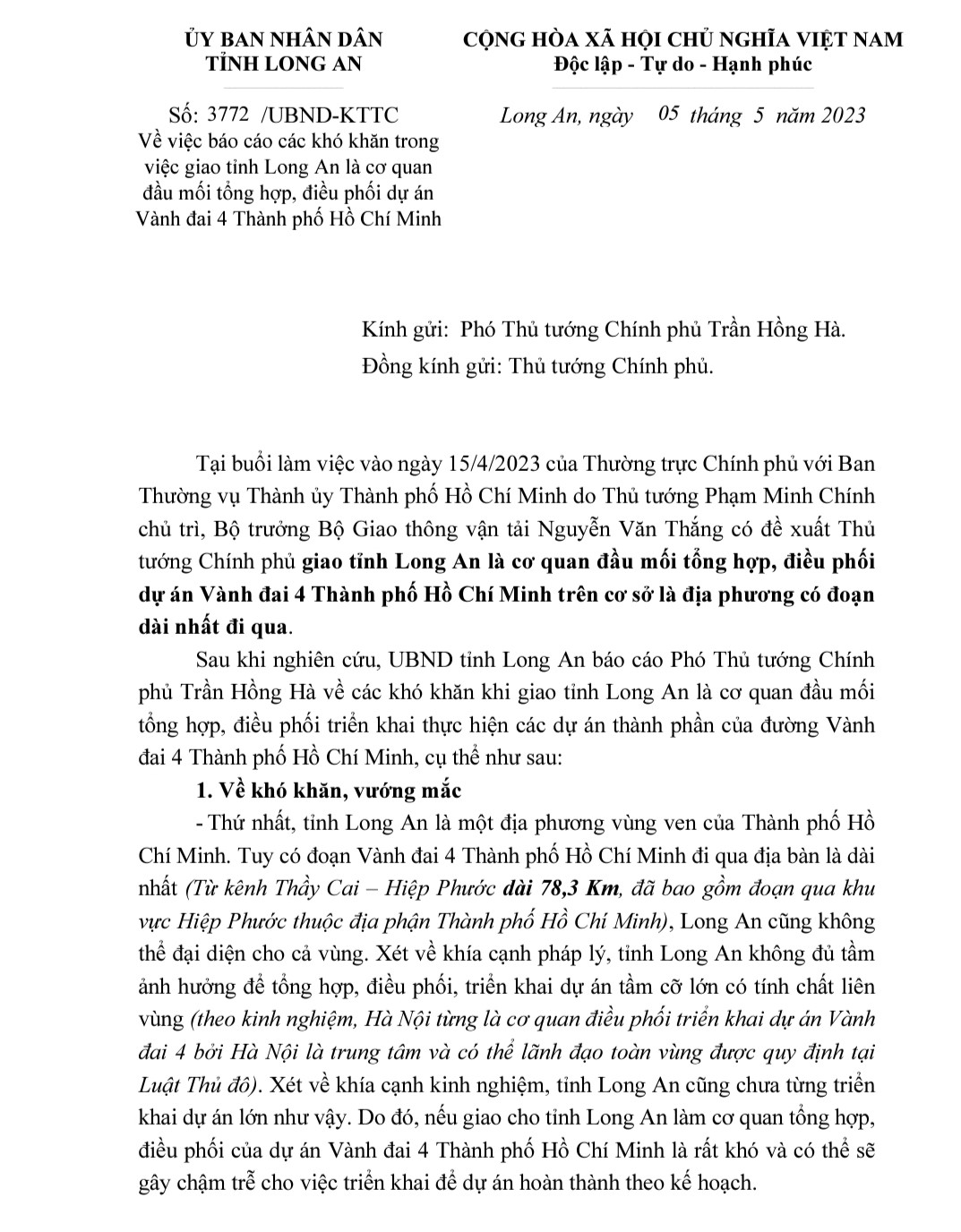 UBND tỉnh Long An kiến nghị Chính phủ giao Bộ Giao thông Vận tải làm cơ quan đầu mối tổng hợp, điều phối dự án đường Vành đai 4 TP.HCM.