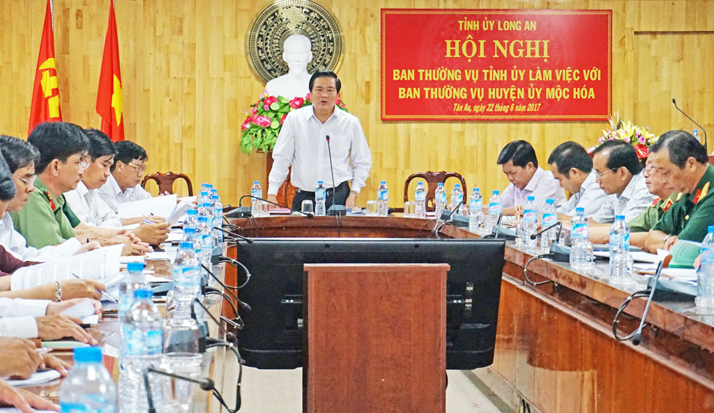 Ban Thường vụ (BTV) Tỉnh ủy Long An làm việc với BTV Huyện ủy Mộc Hóa vào sáng ngày 22/6. Thực hiện Kết luận số 32-KL/TU, ngày 30/3/2016 của Thường trực Tỉnh ủy, BTV Huyện ủy Mộc Hóa cho biết, hiện nay, huyện gặp rất nhiều khó khăn, nhất là nguồn vốn đầu tư xây dựng cơ bản.