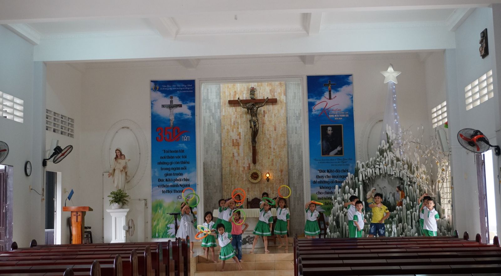 Tại Hội Dòng mến Thánh giá Mỹ Tho, ngoài việc trang hoàng cho lễ Giáng sinh, các sơ đang gấp rút tập luyện văn nghệ cho các bé. Đây là chương trình văn nghệ được các cháu tập luyện để biểu diễn trong đêm Giáng sinh. Các em xúng xính trong những bộ quần áo mới, tập luyện tích cực để đem đến cho đêm Giáng sinh những tiết mục đặc sắc nhất.