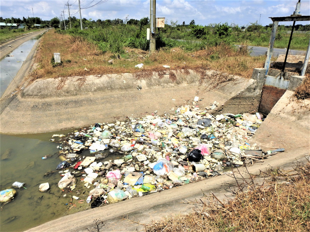 Rác thải bị dồn ứ tại một cống đầu kênh N14-16 (khu vực giáp ranh giữa địa bàn xã Truông Mít và xã Phước Thạnh)
