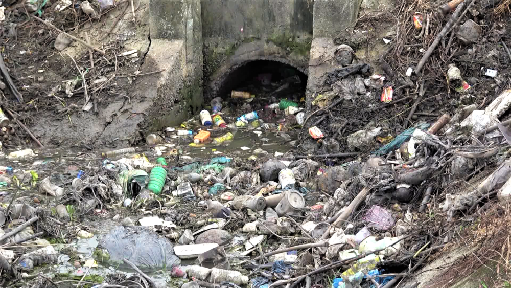 Trong số rác bị dồn ứ tại miệng cống có khá nhiều vỏ chai thuốc bảo vệ thực vật