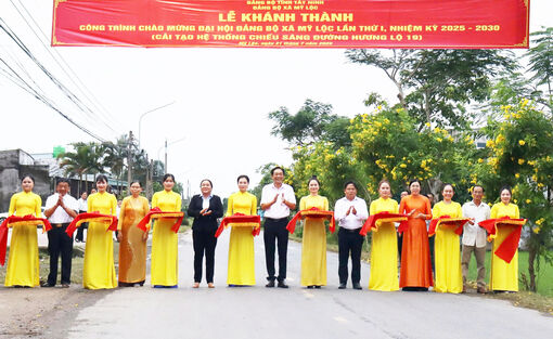 Lãnh đạo xã Mỹ Lộc cắt băng khánh thành công trình cải tạo hệ thống chiếu sáng Hương lộ 19 - công trình chào mừng Đại hội Đảng bộ xã lần thứ I