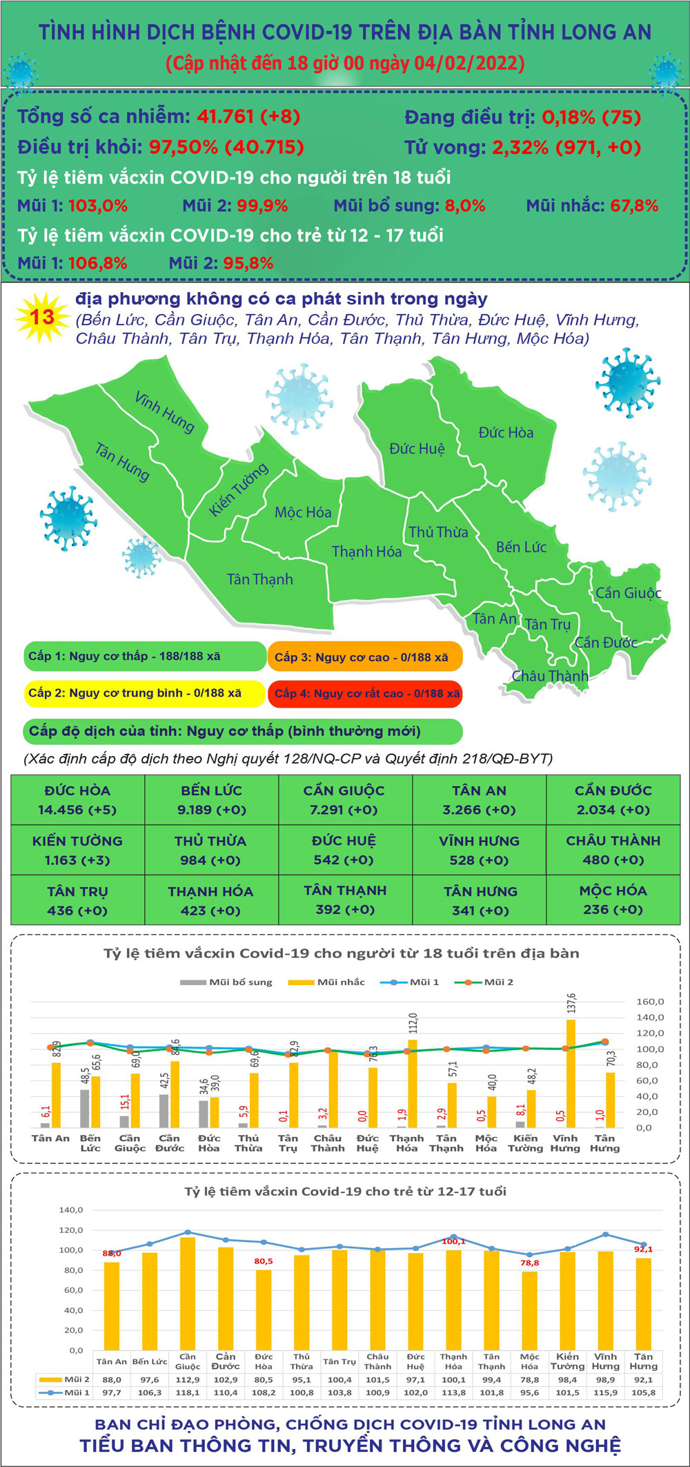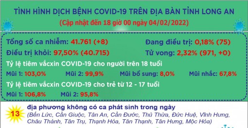 Đến 18 giờ ngày 04/02, Long An ghi nhận 41.761 ca mắc Covid-19; trong 24 giờ qua có 8 ca mắc mới.