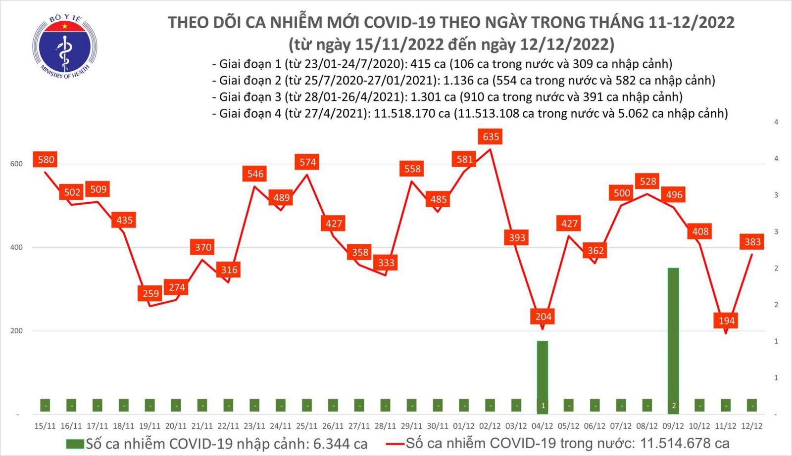 Bản tin phòng chống dịch COVID-19 ngày 12/12 của Bộ Y tế cho biết, có 383 ca mắc COVID-19, tăng gần 200 ca so với hôm qua. Hôm nay bệnh nhân nặng cũng tăng lên và tiếp tục không ghi nhận bệnh nhân COVID-19 tử vong.