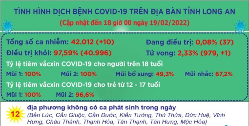 Đến 18 giờ ngày 19/02, Long An ghi nhận 42.012 ca mắc Covid-19; trong 24 giờ qua có 10 ca mắc mới.
