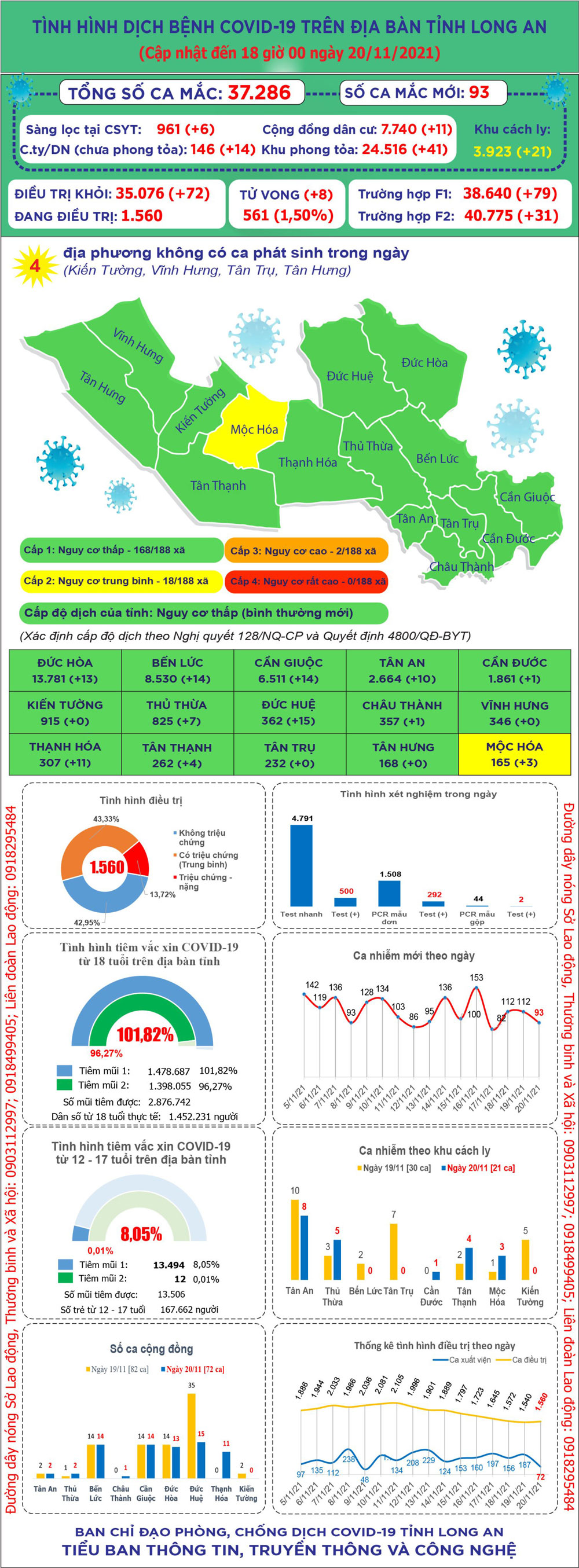 Đến 18 giờ ngày 20/11, Long An ghi nhận 37.286 ca mắc Covid-19; trong 24 giờ qua có 93 ca mắc mới.