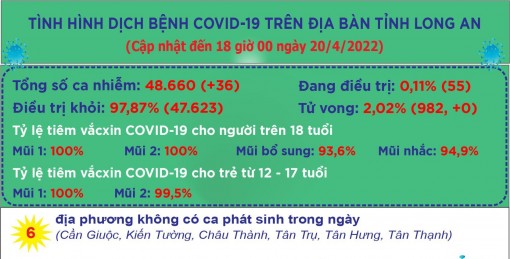 Đến 18 giờ ngày 20/4, Long An ghi nhận 48.660 ca mắc Covid-19; trong 24 giờ qua có 36 ca mắc mới.