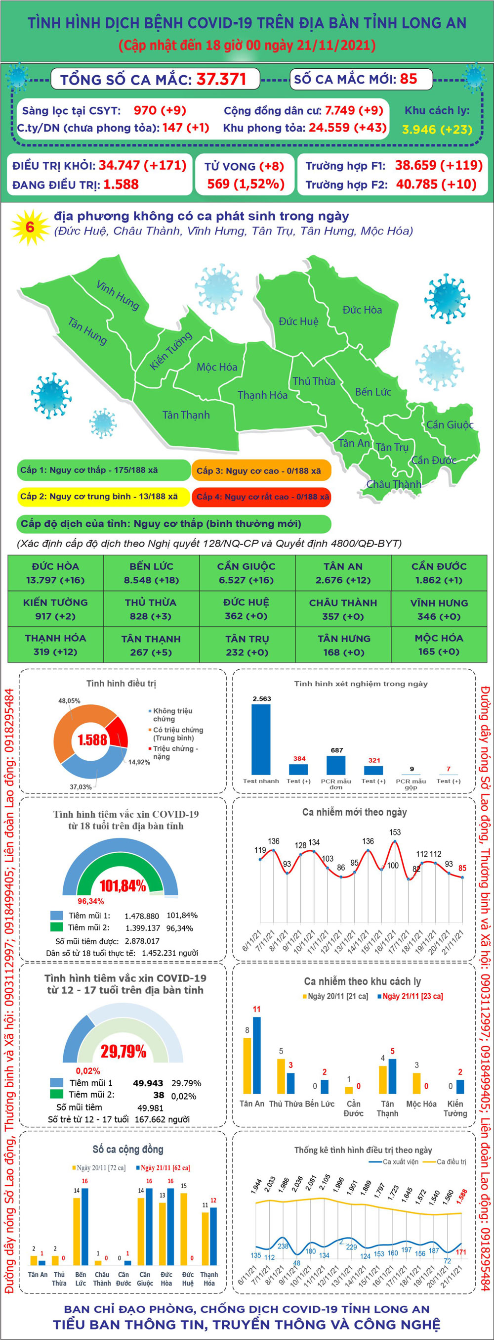 Đến 18 giờ ngày 21/11, Long An ghi nhận 37.371 ca mắc Covid-19; trong 24 giờ qua có 85 ca mắc mới.