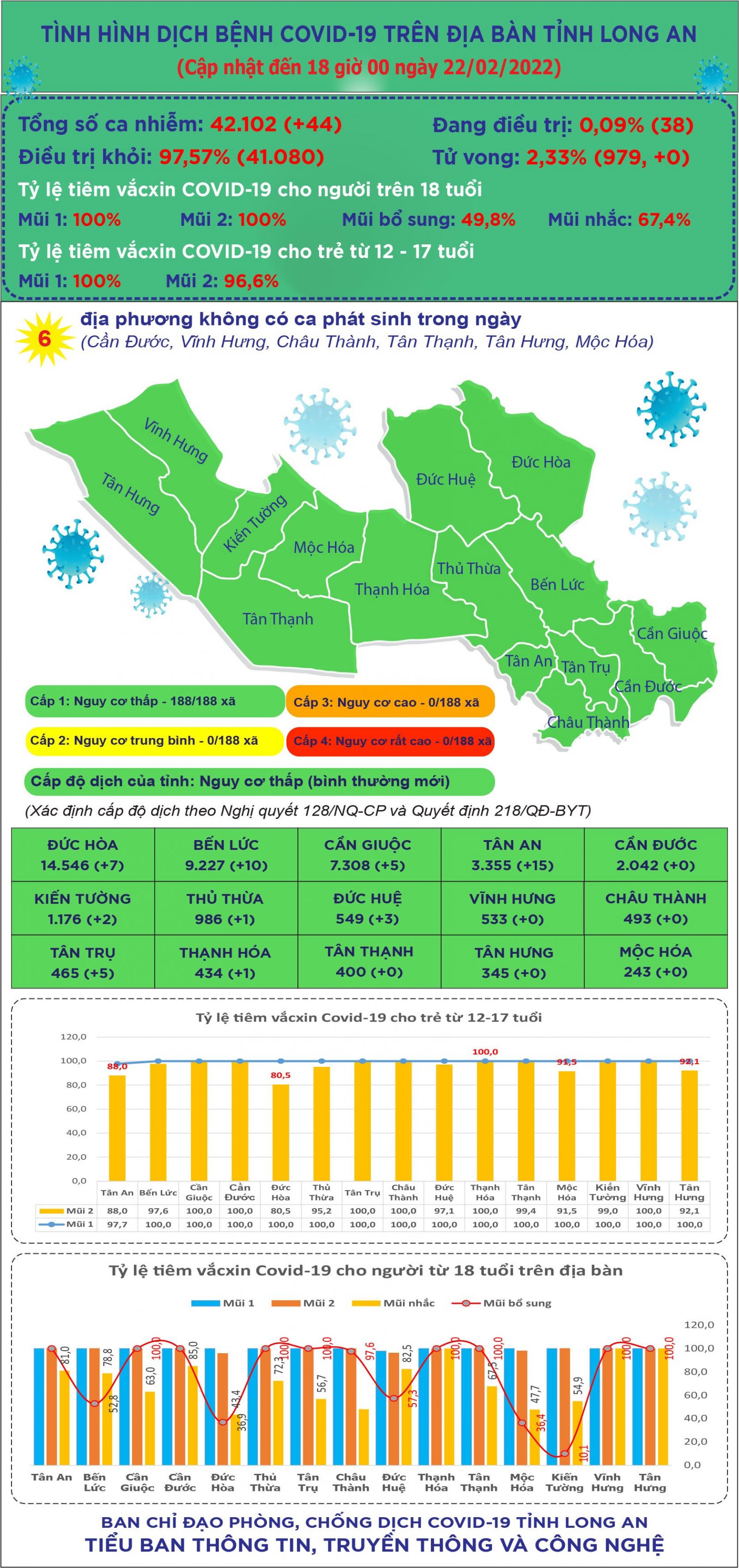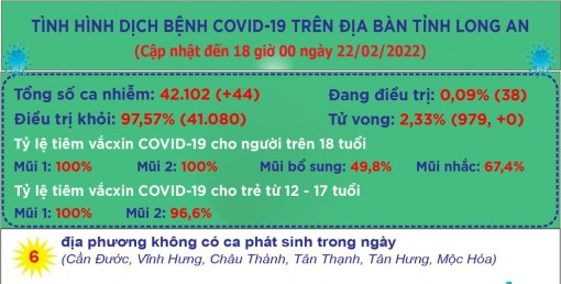 Đến 18 giờ ngày 22/02, Long An ghi nhận 42.102 ca mắc Covid-19; trong 24 giờ qua có 44 ca mắc mới.