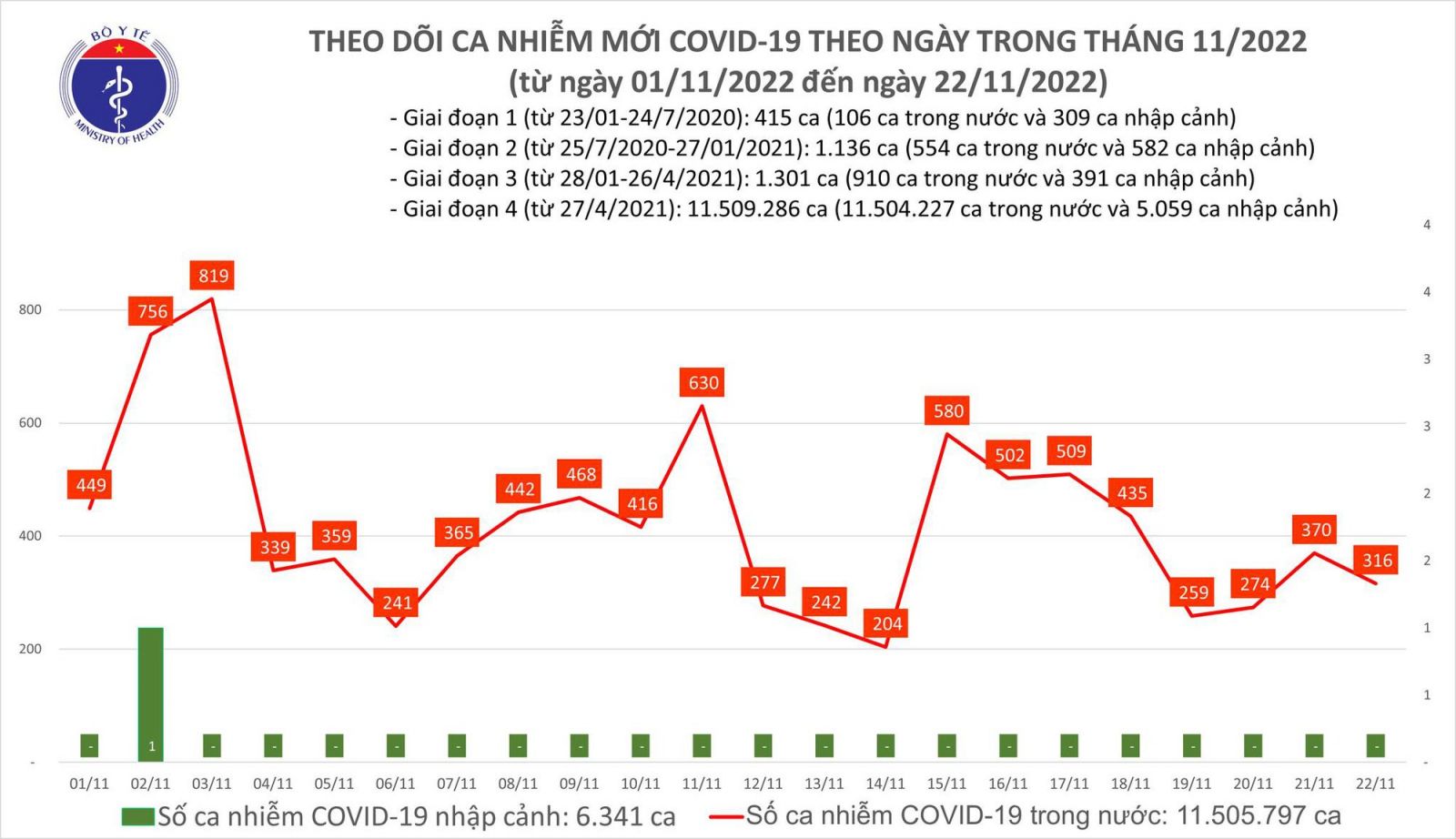 Bản tin phòng chống dịch COVID-19 của Bộ Y tế ngày 22/11 cho biết có 336 ca mắc COVID-19 mới, bệnh nhân nặng giảm còn 49 người, trong ngày không có bệnh nhân tử vong.
