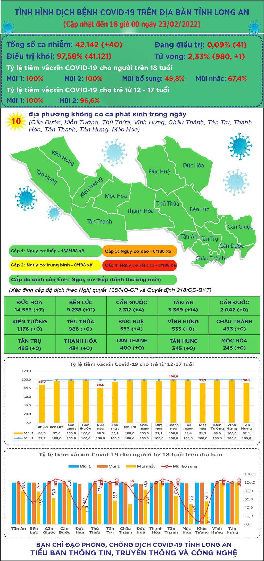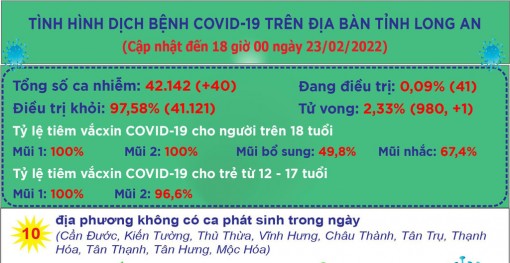 Đến 18 giờ ngày 23/02, Long An ghi nhận 42.142 ca mắc Covid-19; trong 24 giờ qua có 40 ca mắc mới.
