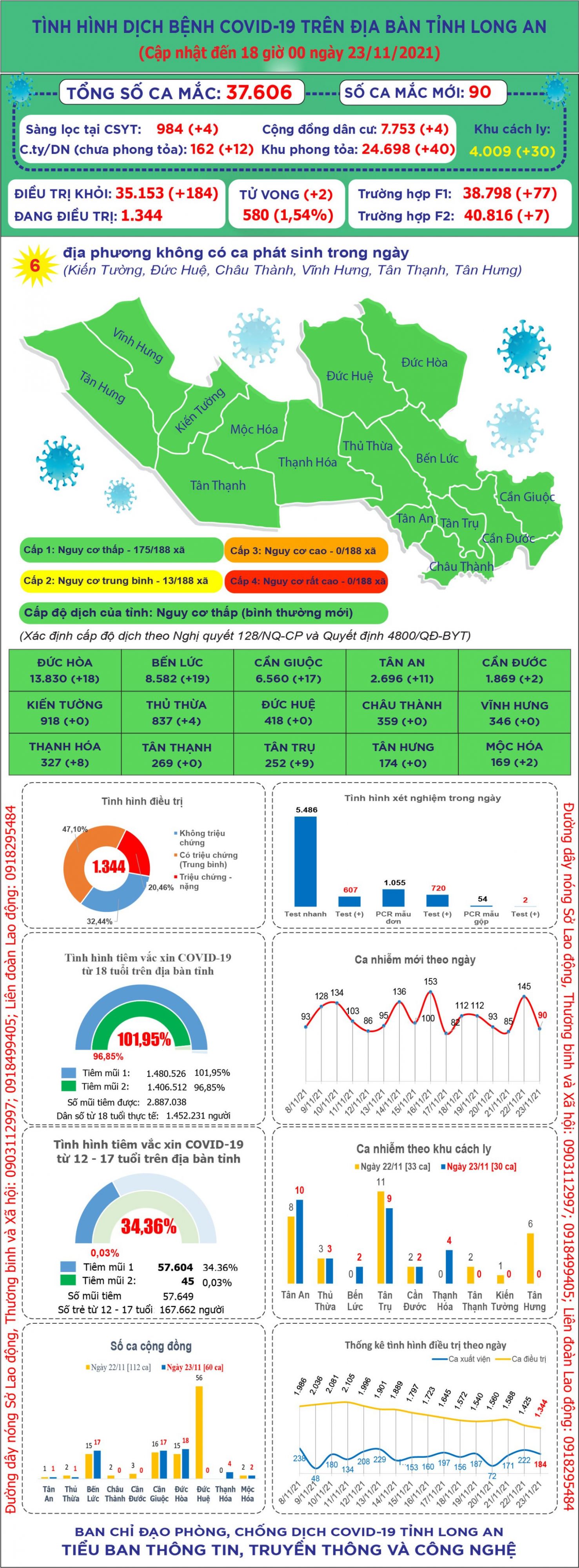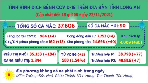 Đến 18 giờ ngày 23/11, Long An ghi nhận 37.606 ca mắc Covid-19; trong 24 giờ qua có 90 ca mắc mới.