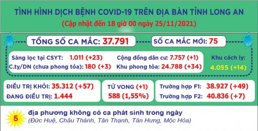 Đến 18 giờ ngày 25/11, Long An ghi nhận 37.791 ca mắc Covid-19; trong 24 giờ qua có 75 ca mắc mới.