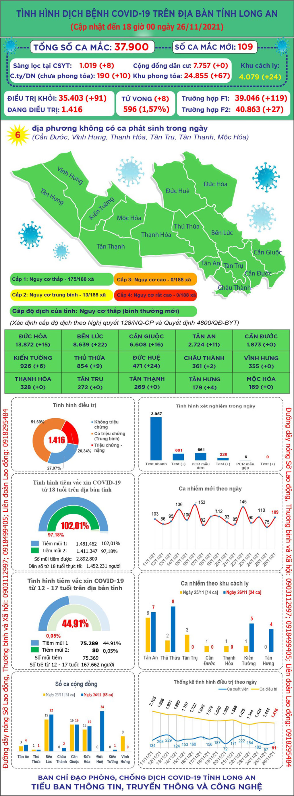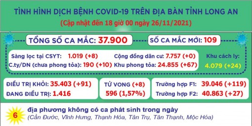 Đến 18 giờ ngày 26/11, Long An ghi nhận 37.900 ca mắc Covid-19; trong 24 giờ qua có 109 ca mắc mới.