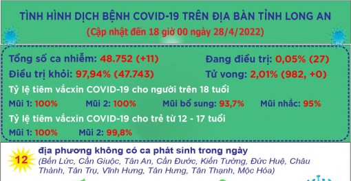 Đến 18 giờ ngày 28/4, Long An ghi nhận 48.752 ca mắc Covid-19; trong 24 giờ qua có 11 ca mắc mới.