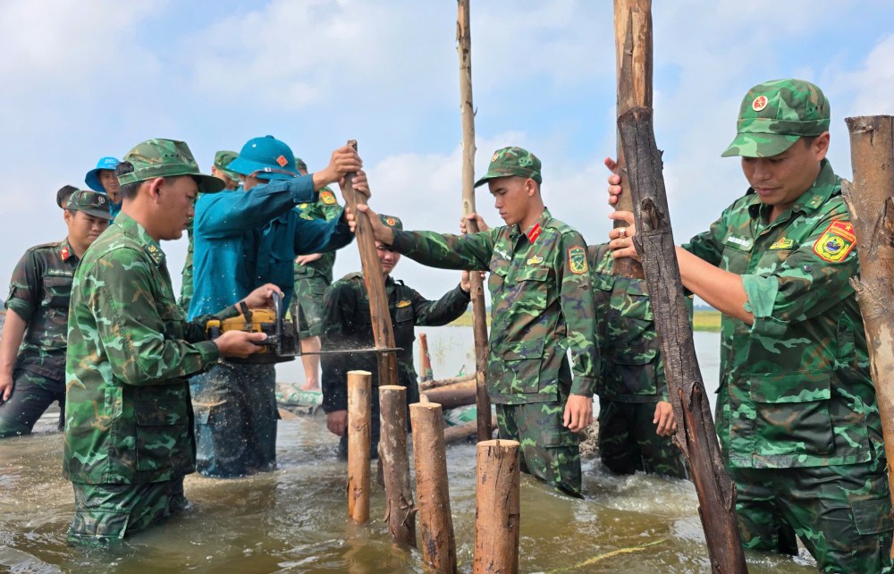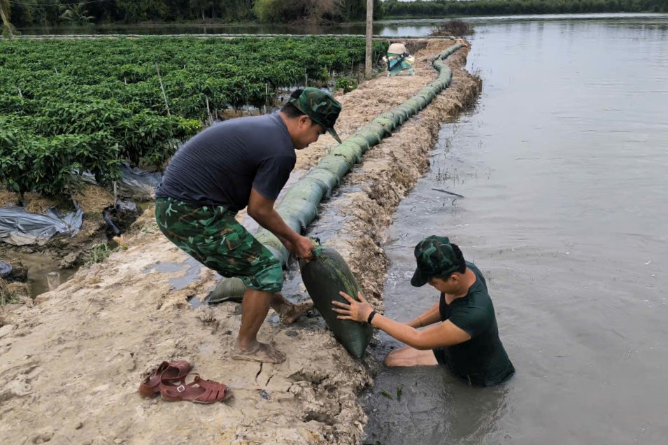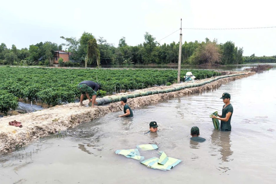 Ngay sau khi người dân thông tin cần hỗ trợ gia cố đê bao vì mực nước dâng cao, cán bộ, chiến sĩ Đồn Biên phòng Mỹ Thạnh Tây nhanh chóng có mặt, trầm mình dưới nước, vận chuyển từng bao đất để ngăn nước tràn vào ruộng, bảo vệ thành quả sản xuất cho người dân