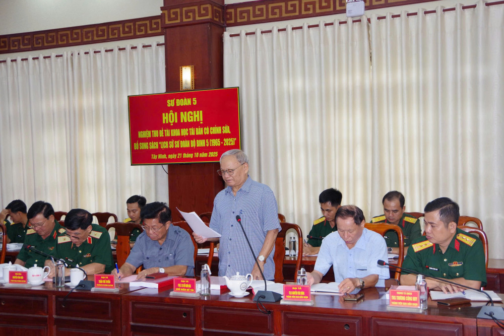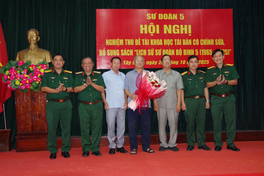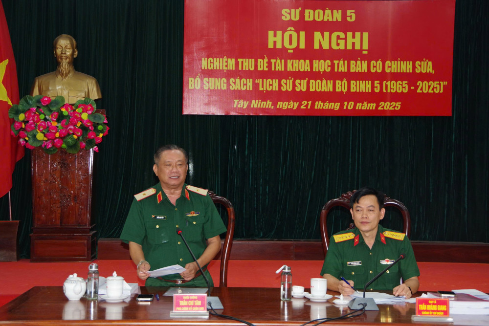 Ngày 21/10, Sư đoàn 5 tổ chức hội nghị nghiệm thu Đề tài khoa học tái bản có chỉnh sửa, bổ sung sách “Lịch sử Sư đoàn bộ binh 5 (1965-2025)”. Thiếu tướng Trần Chí Tâm - Ủy viên Ban Thường vụ Đảng ủy, Phó Chính ủy Quân khu dự chỉ đạo hội nghị.